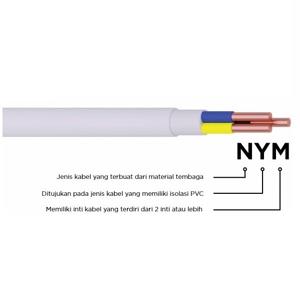 – Kabel NYM yaitu kabel tegangan rendah tanpa perisai dengan bahan inti/penghantar tembaga yang dianilkan (pemanasan kemudian didinginkan pelan-pelan), dengan isolasi selubung PVC