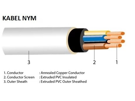 – Kabel NYMHY adalah jenis kabel dengan inti tembaga serabut sehingga bersifat fleksibel dengan isolasi PVC dan berselubung/berpelindung luar PVC